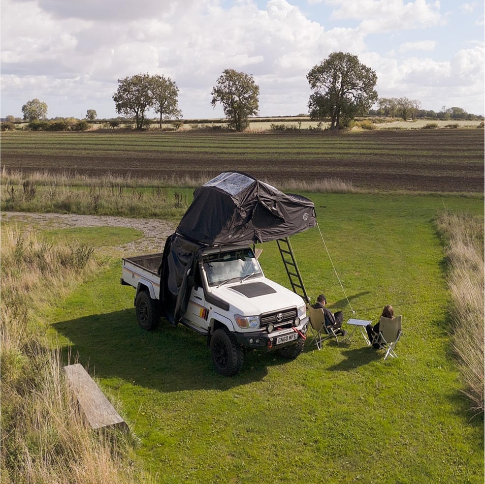 For those without a roof-top rig of their own, our Toyota Land Cruiser is ready and waiting. Parked up with space to pitch beside it, this setup gives you the adventure vibe without needing the big car. Complete with a picnic table for laid-back meals outdoors, it’s an easy way to enjoy the Kip & Nook camping experience.